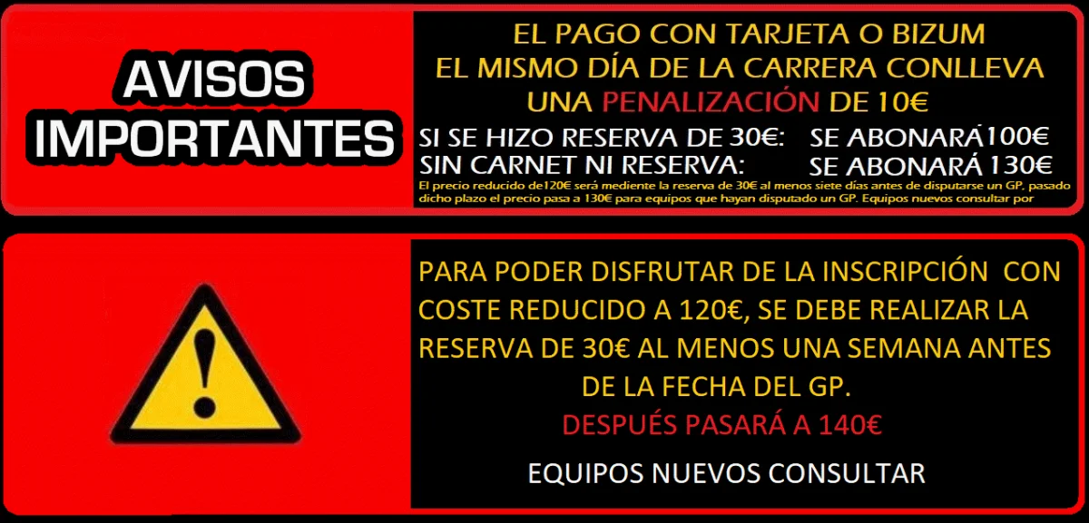 Cada equipo realizará un pago de 30€ por bizum o transeferencia en concepto de reserva al menos 7 días antes del GP,